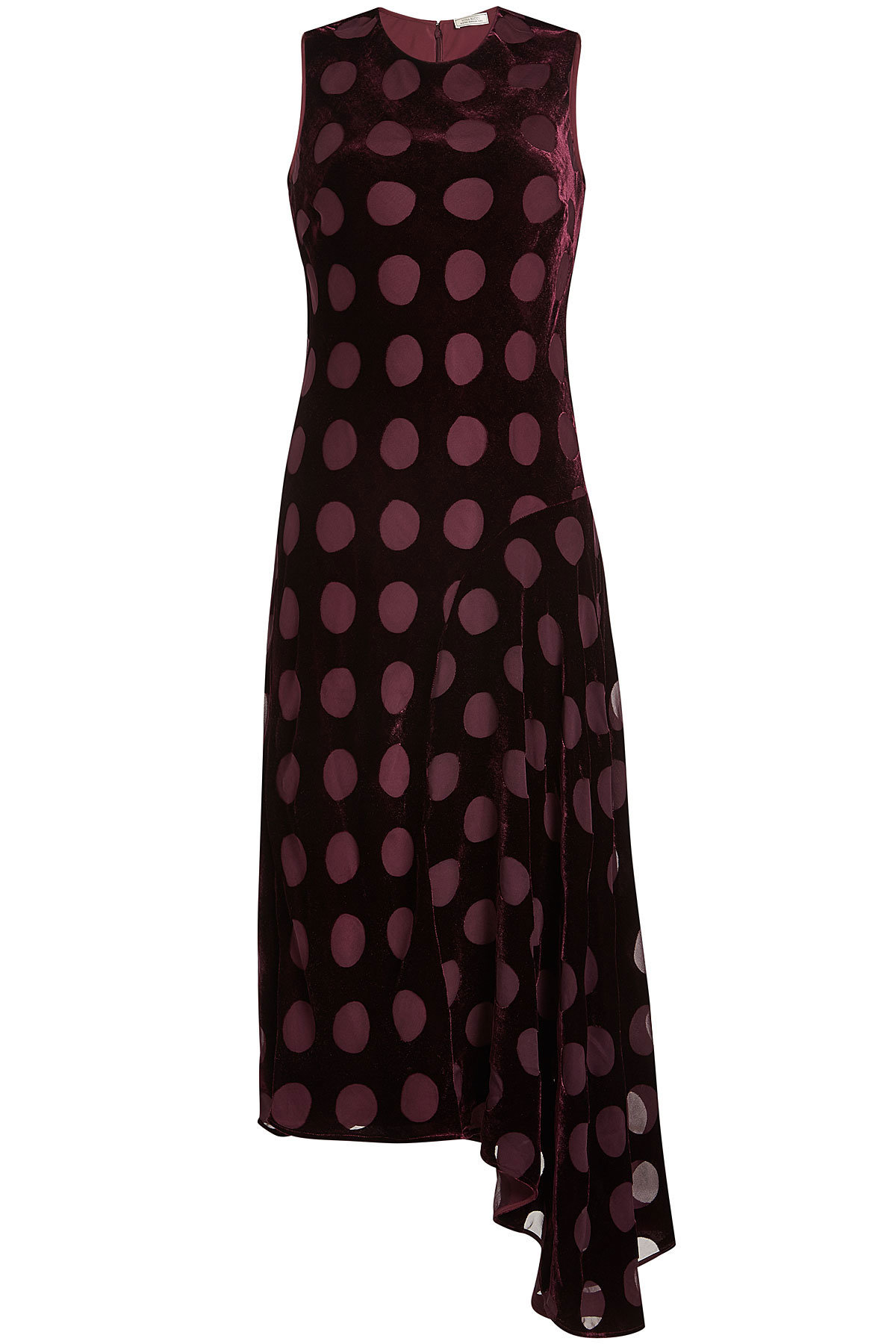 Colored in wine red, this Nina Ricci gown is floor-grazing with a dramatic length and cut with a sleeveless upper for feminine simplicity. The heady velvet texture and chiffon spots combine to make it a rich choice while the asymmetric ruffle at the hem lends modernity. 82% Viscose, 18% Silk Sizes: FR 36,FR 38,FR 40
