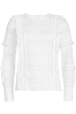A statement with tailored finesse, this white pinstriped blouse from Self-Portrait is styled with cold shoulders, breathing sensual skin-baring attitude into the modest cut of the body. Ruffle trims keep the look fun and voluminous. 97% Polyester, 3% Viscose Sizes: UK 8,UK 12,UK 14,UK 4,UK 6,UK 10