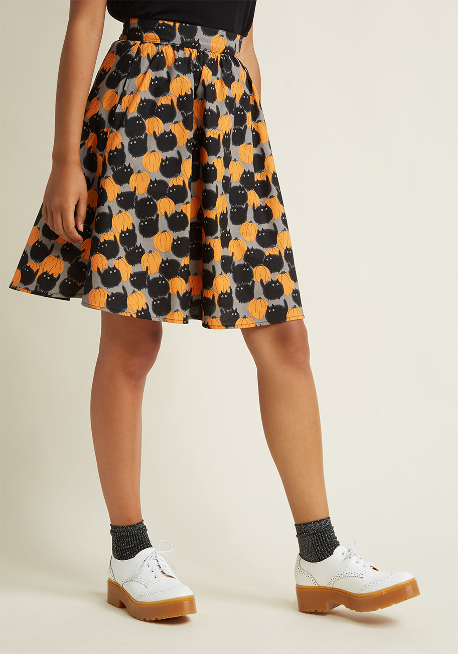 Who, you? You're just rocking an amazing novelty print skirt, like usual! Covered with fuzzy black cats and plump pumpkins, this grey cotton bottom - made in LA by Retrolicious - invites seasonal style into your everyday unfolding of events. Sizes: XS/S/M/L/XL/1X/2X/3X/4X